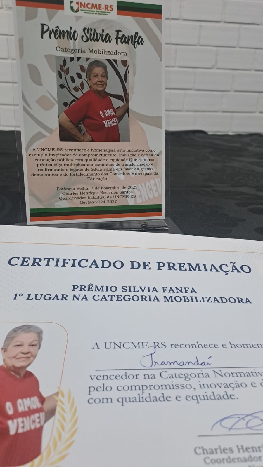 O prêmio foi recebido pela Presidente do CME, Susana Medeiros Cunha, durante a cerimônia realizada no Seminário Técnico da UNCME-RS, na UNISINOS, em São Leopoldo, com a presença de representantes de Conselhos Municipais de Educação de todo o estado.