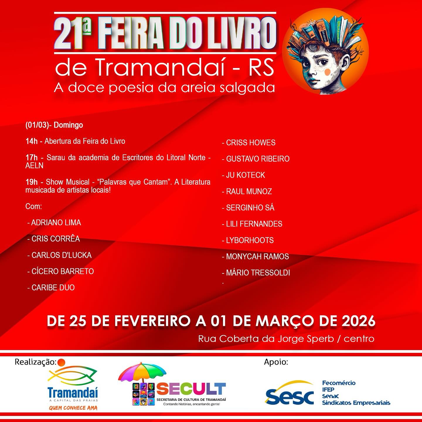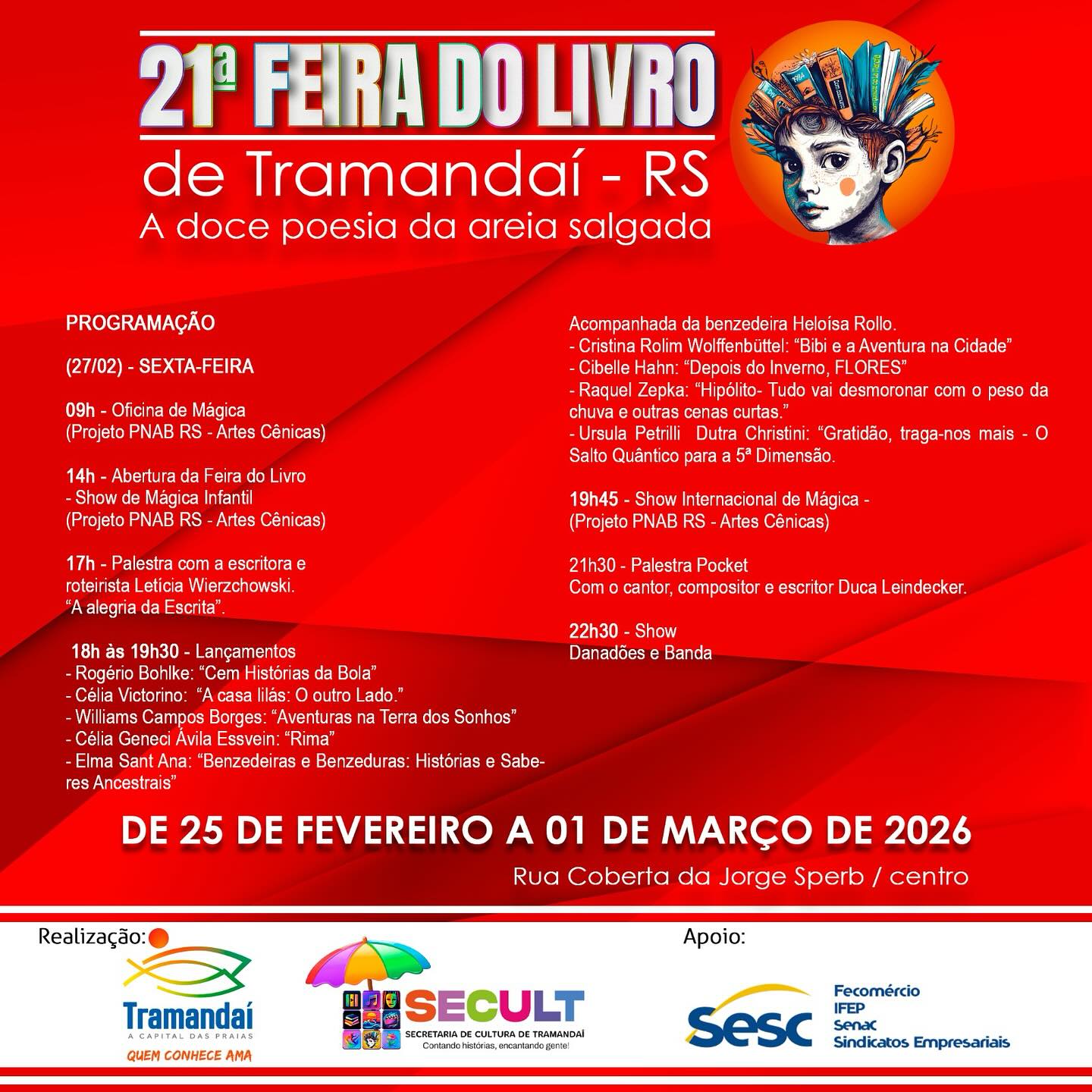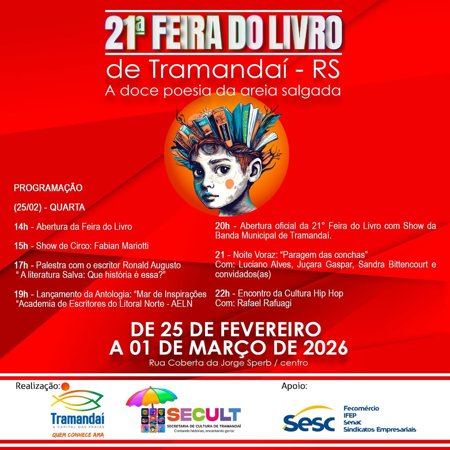A Prefeitura de Tramandaí, por meio da Secretaria de Cultura, convida a comunidade e visitantes para prestigiar a 21ª Feira do Livro de Tramandaí, que acontece de 25 de fevereiro a 1º de março de 2026, na Rua Coberta da Jorge Sperb, no Centro.